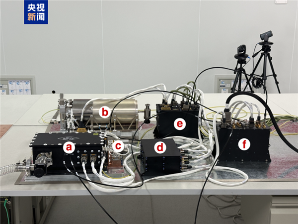 VLBI专用载荷设备包括X波段低温接收机及制冷机控制单元(如图a,c,d)、被动氢原子钟(b)、变频和数据采集后端(f)、VLBI馈源、波束波段及电缆组件等。