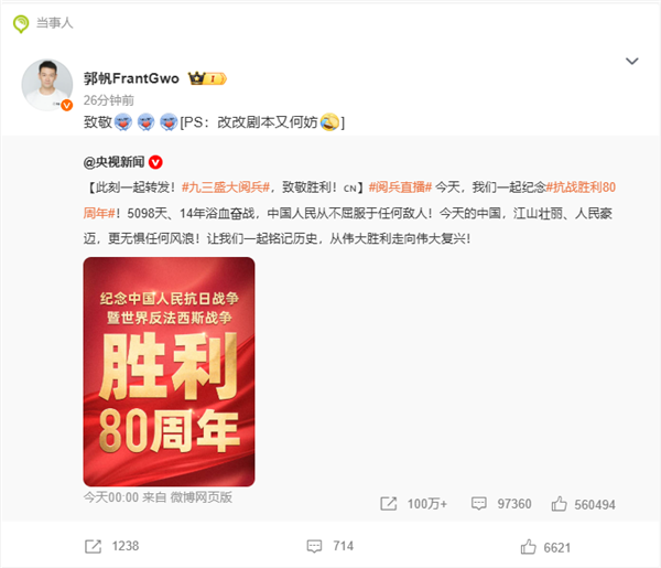 网友看完阅兵呼吁郭帆赶紧改《流浪地球3》剧本:再不改就成记录片了