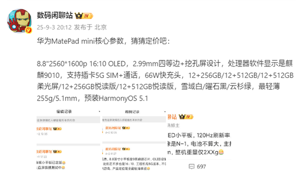 9月3日消息,华为MatePad mini将在明天正式发布,博主数码闲聊站提前公布了新机的核心参数。