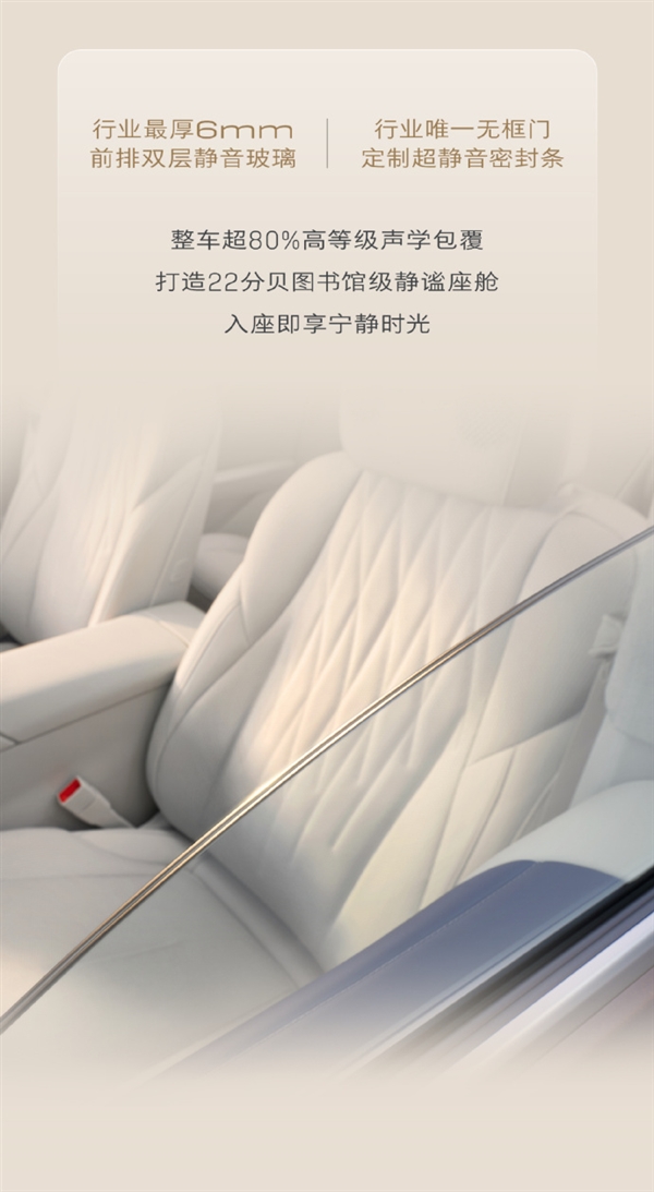 车辆前排采用6mm双层静音玻璃,无框车门配备超静音密封条,整车超80%区域为高等级声学包覆,官方宣称可实现22分贝的图书馆级静音表现。
