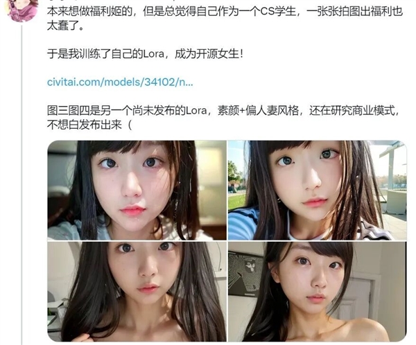 两年前,一位加州大学的学生,用三百多张近距离的自拍照,训练了一个叫做奈奈的Lora模型。