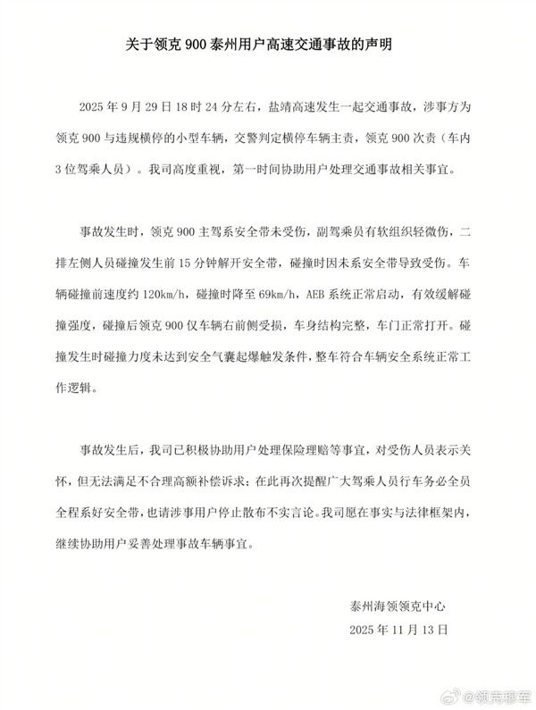 事故发生时,领克900主驾系安全带未受伤,副驾乘员有软组织轻微伤,二排左侧人员碰撞发生前15分钟解开安全带,碰撞时因未系安全带导致受伤。