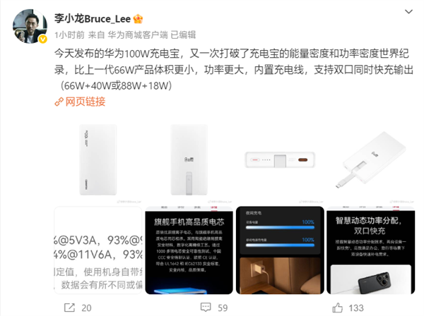 李小龙:华为打破了充电宝能量密度、功率密度世界记录