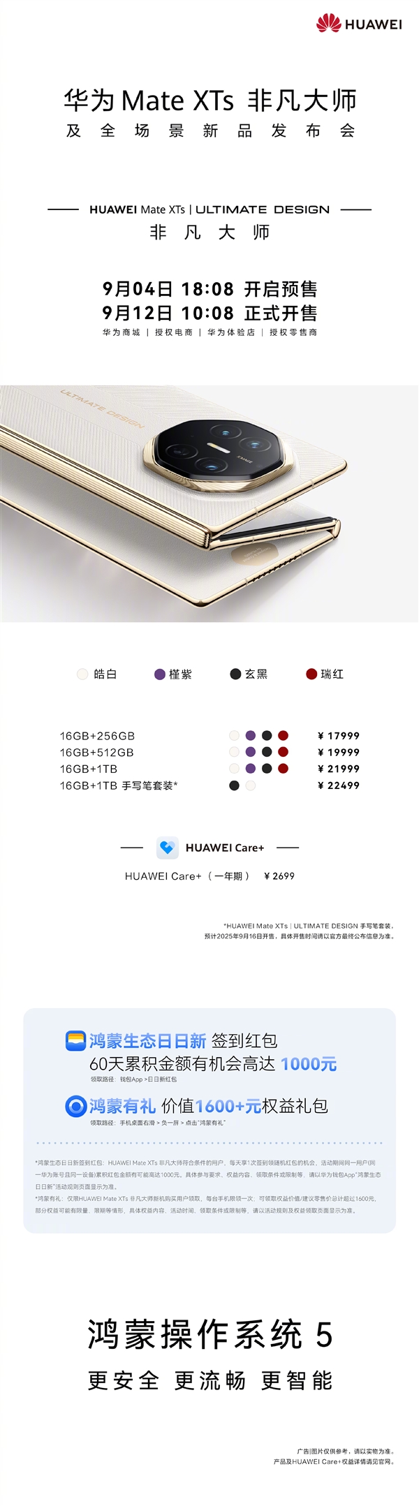 有皓白、槿紫、玄黑、瑞红四款配色,9月4日18:08开启预售,9月12日10:08正式开售。