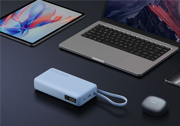 充电宝自身充电也很快,USB-C自带线支持65W MAX输入功率,约2.5小时就能充满。