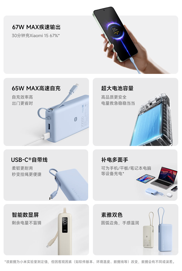 小米火速推出了全新版本“小米自带线充电宝20000 67W”,目前已经在官网上架,定价179元,将于9月8日开售。