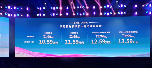 11月19日消息,今日晚间,2026款东风星海S7正式上市,共推出4款车型,指导价区间为11.99-14.99万元,限时置换一口价为10.59-13.59万元。