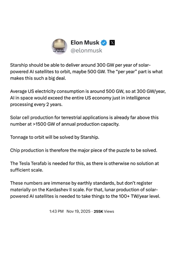 在美国沙特投资论坛之后的第二天,马斯克再次强调,这些AI卫星每年能产生100吉瓦的太阳能——相当于美国年平均用电量的四分之一。“我们已经把计划完全排出来了,会非常疯狂。”