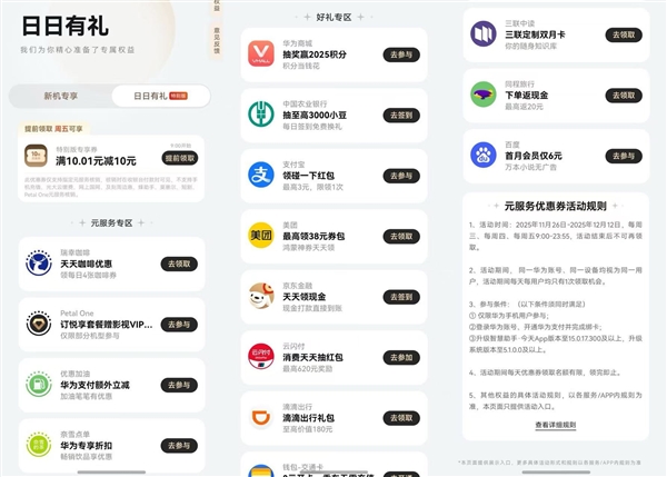 随着新品的发布,华为负一屏也同步面向鸿蒙5.1及以上设备再次推出鸿蒙有礼特别版:即日起至12月12日,每周三、四、五可领取一张满10.01元立减10元的元服务优惠券,每周五可核销,用户不仅可以在中免日上元服务购小样,还可以在美团外卖、瑞幸、奈雪、猫眼、同程等覆盖吃喝玩乐的多个元服务使用10元的减免券。无论是午餐外卖加餐、还是周五与同事的甜甜下午茶、亦或是周末与好友相约《疯狂动物城2》,都可以桌面右滑进入负一屏,提前抢券周五下单,省钱还方便。