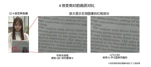 AI学习型阵列重排可用于传统方式难以再现的高频成分的信号处理,在精细图案、文字等微观细节表现上呈现更高的还原能力。同时该技术的片上集成还使高速处理成为可能,从而支持在4K分辨率下在最高4倍变焦下进行30fps高画质视频拍摄。
