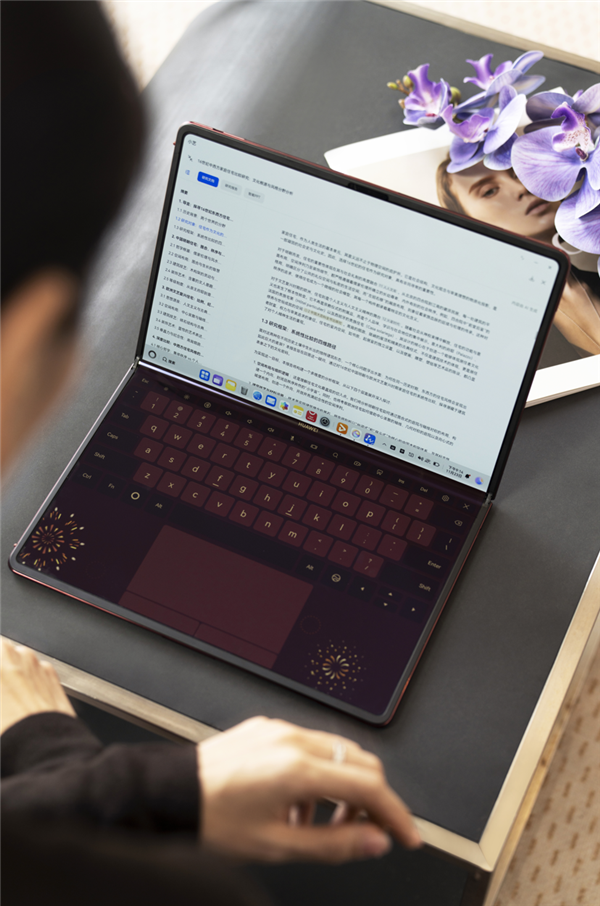 两款新机型的外观设计,藏着华为对美学与实用的双重考量。华为MateBook Fold 非凡大师 瑞红自带东方文化底蕴,温润的红调基底搭配高端素皮材质,触感柔软且富有韧性,素皮表面暗藏中国结灵感的压纹,在光线照射下会呈现出含蓄的层次感。机身融合了科技金属边框与传统纹理,商务洽谈时拿出手,既能彰显专业气度,又能通过独特的设计传递审美品位,成为商务场合中无声的社交名片。拂晓粉的柔与瑞红的韵,让生产力工具不再是冰冷的设备,更成了个人审美与品位的延伸。