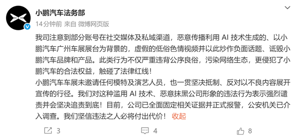 广州车展小鹏展台现低俗视频!小鹏法务部:有账号利用AI生成 已报警