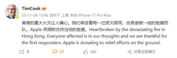 苹果CEO库克:香港重大火灾让人痛心 将捐款支持当地的救援