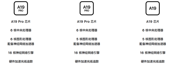 与前代iPhone相比,这次苹果将机型搭载的处理器进行更细致的划分:iPhone 17搭载基础版的A19芯片,iPhone Air搭载A19 Pro芯片,iPhone 17 Pro /Pro Max搭载A19 Pro(满血版)芯片,二者的主要差别是前者少了一个GPU核心。