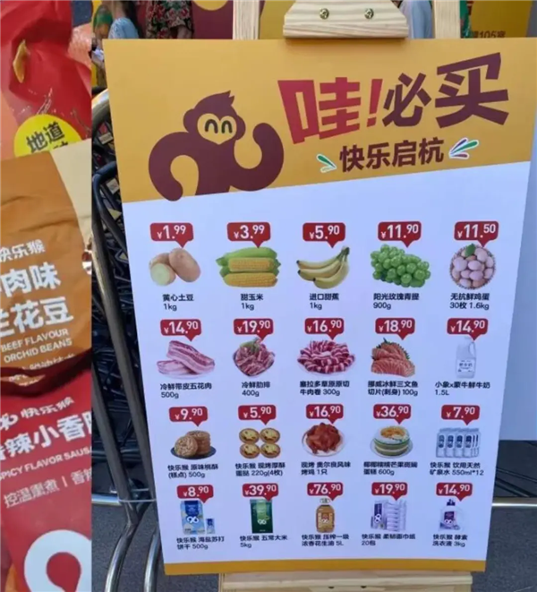 盒马 NB 就像一个“ 砍一刀 ”的盒马。主打的就是一个便宜,1.8 的可乐、9.9 的抽纸( 8包 ),7.9 的鲜牛奶( 1L ),让路过的男女老少们都服了。