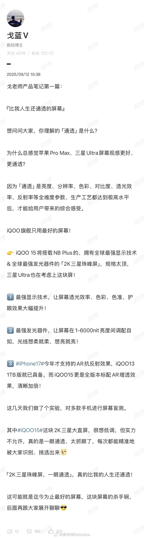 iQOO 15首发2K珠峰屏 产品经理:太抓眼了 三星Ultra也在考虑用