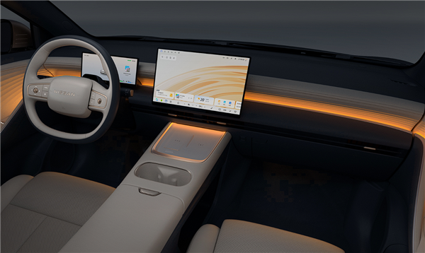 内饰设计延续N7,采用环抱式风格,极简风格的双幅式方向盘,再加上双拼色的组合,营造出不错的视觉效果,车内大面积使用了软包包覆,面积达2.8㎡,还有256色光瀑式智能氛围灯的点缀。