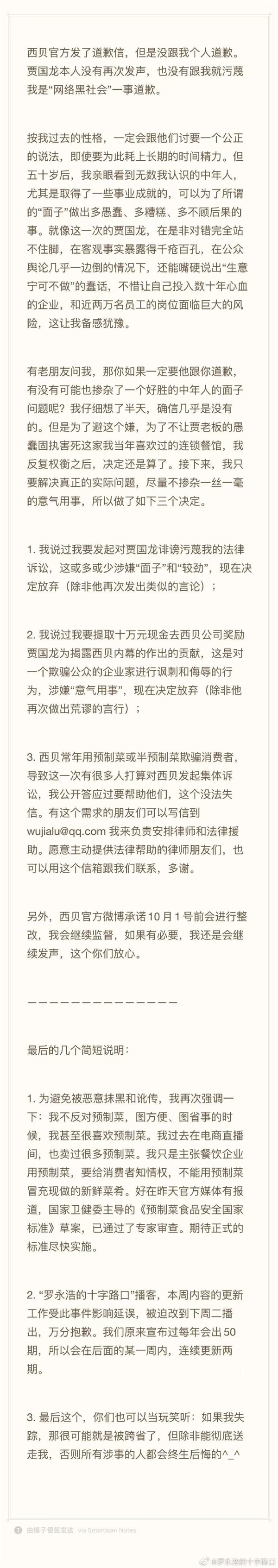 但为了不让贾老板的愚蠢固执害死这家自己当年喜欢过的连锁餐馆,罗永浩反复权衡之后,称决定还是算了。