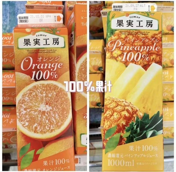 再分享一个小知识,在日本,只有100% 纯果汁,才能在包装上印水果切开的图片,果汁含量在5-99%,包装上可以有水果,但不能切开。