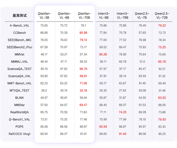 在通用能力基准测试中,Qianfan-VL系列模型(3B、8B、70B)展现出显著核心优势。