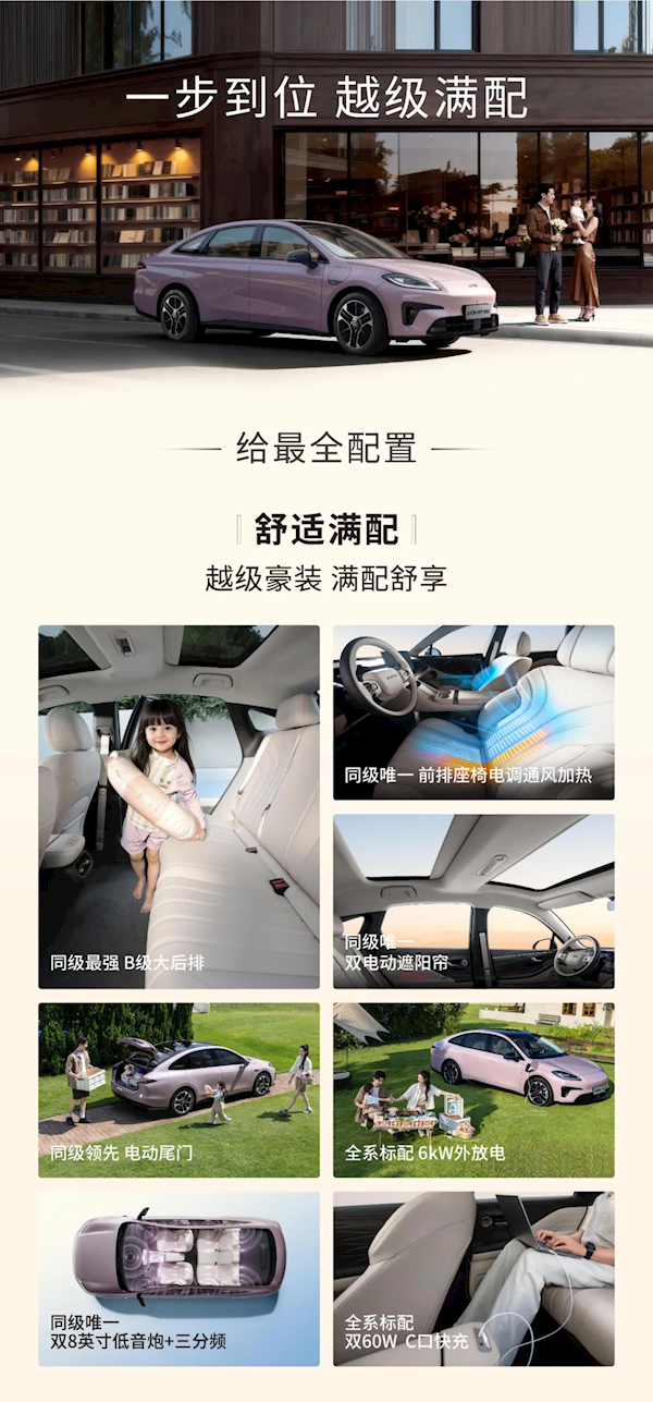 400V碳化硅电机最大功率分别为150kW和165kW,新车的综合电耗只有11.7kWh/100km和11.9kWh/100km,与同级车型相比,电耗相当优异。