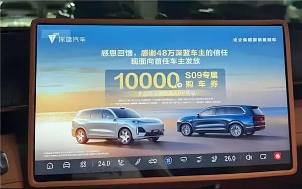 部分深蓝车主启动车辆之后,车机系统弹出了深蓝S09车型的购车补贴广告,内容为 “感谢48万深蓝车主的信任,现面向首任车主发放10000元深蓝S09专属购车券”。