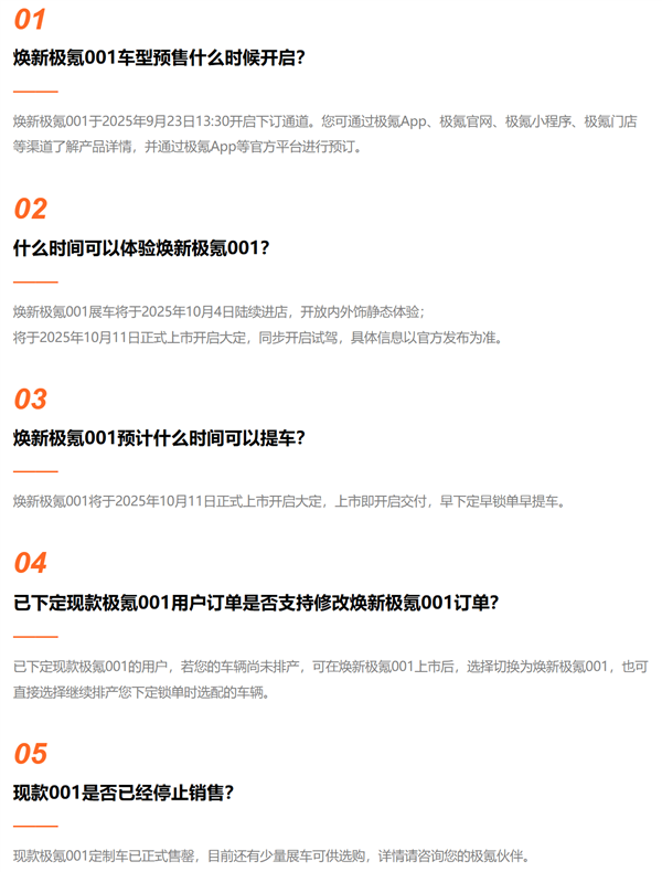 根据官方规划,焕新极氪001展车将于10月4日到店,10月11日上市即发布,即刻交付。