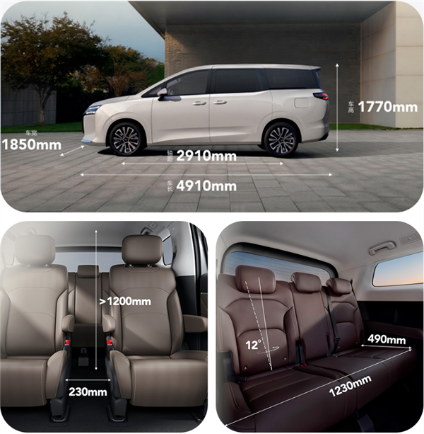 该车长宽高分别为4910*1850*1770mm,拥有2910mm超长轴距,并采用“2+2+3”真7座布局。