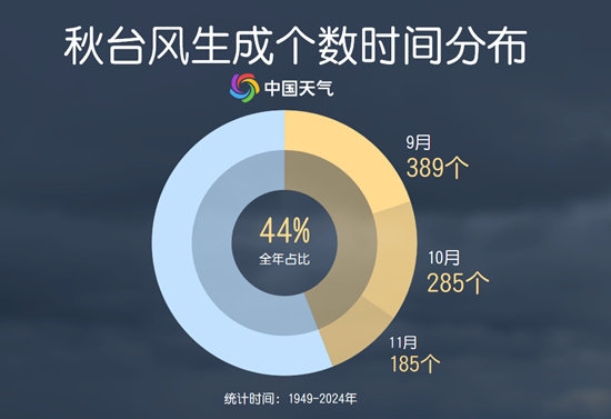 统计显示,1949年至2024年间,夏季生成台风个数为867个,为台风最活跃季节,而秋季也有859个台风生成,全年占比44%,仅次于夏季。