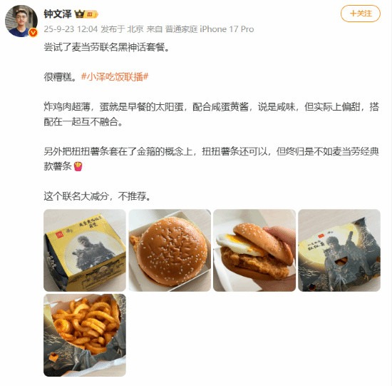 钟文泽体验《黑神话》联名麦当劳:不推荐!
