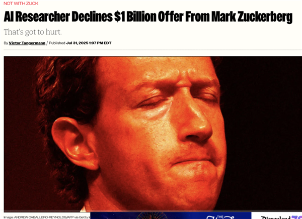 扎克伯格在商战中崇尚简单粗暴直接。过去几个月时间,他的Meta展开了一场“人才闪电战”,对OpenAI、谷歌、苹果等公司展开了一场突袭,用难以置信的报价直接大量挖走顶尖AI技术人才。