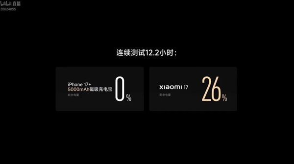连测 12.2 个小时,在 iPhone 17 耗完自身电量,外加 5000mAh 磁吸充电宝续命的情况下,直到 iPhone17 关机,小米17 还能有 26% 的电量。