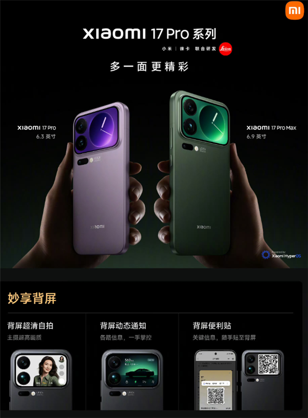 但其实小米 17 Pro 多了个 「妙享背屏」,摄像头模组的右侧区域,直接是块完整的显示区域。
