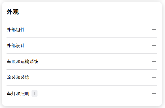 而到了外观定制,又分成了组件、涂装和车灯等 5 个部分,每个部分又有好几种选择,少则五六种,多则十几种。。。