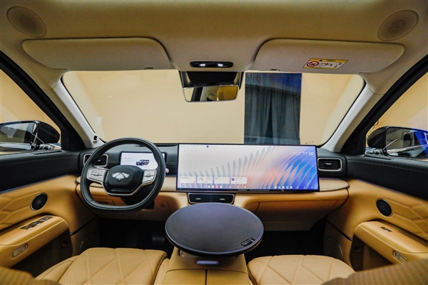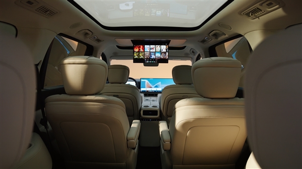 中控台采用大面积的软包材质,并配备256色的氛围灯以及三种香氛,全车配备23扬声器,第二排提供了一个17.3英寸的超大屏,还提供了9.2L的冷暖冰箱,可以塞下8瓶水,配置相当丰富。