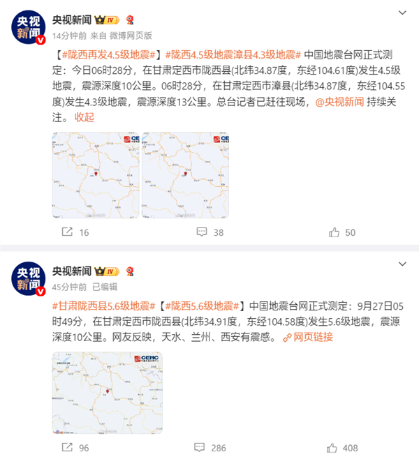 甘肃定西市陇西县连发5.6级/4.5地震、漳县4.3级地震