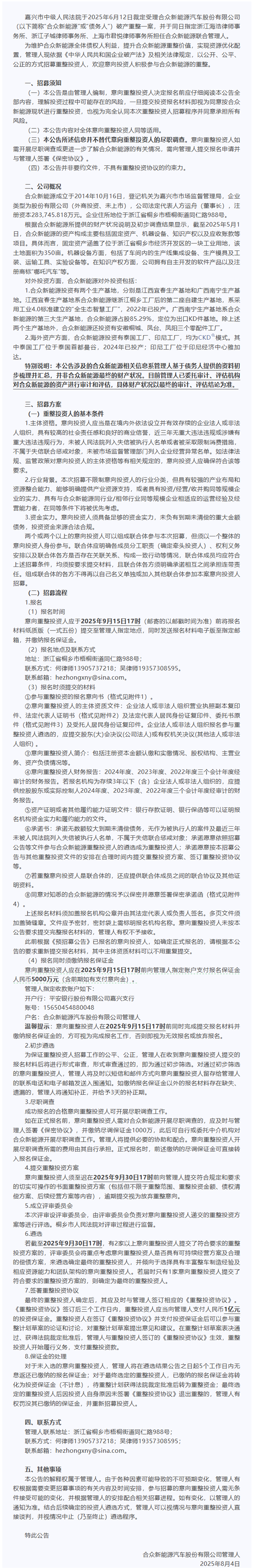 合众新能源管理人公众号上月4日发布《关于公开招募重整投资人的公告》,对公司概况、招募方案等进行了介绍。