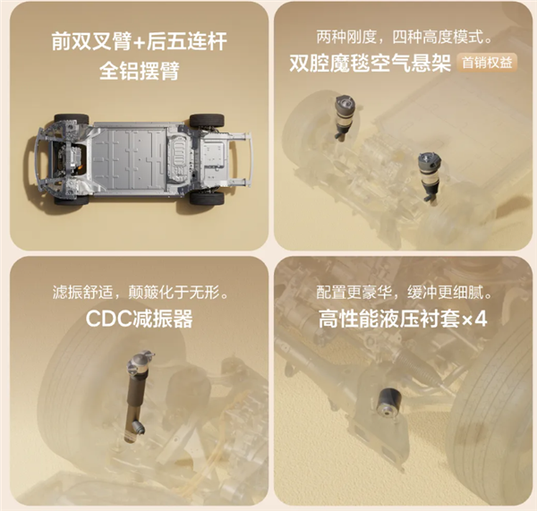 i6底盘配置也不低,前双叉臂+后五连杆,给了全铝摆臂,双腔空簧+CDC。