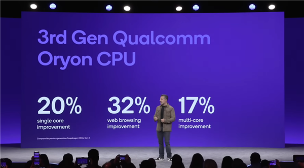 根据官方给到的数据,相比上一代骁龙 8 至尊版,这代 CPU 单核性能提升了 20%,多核提升了 17%,同时响应速度也提升了 32%,整体功耗则是降低了 35%。