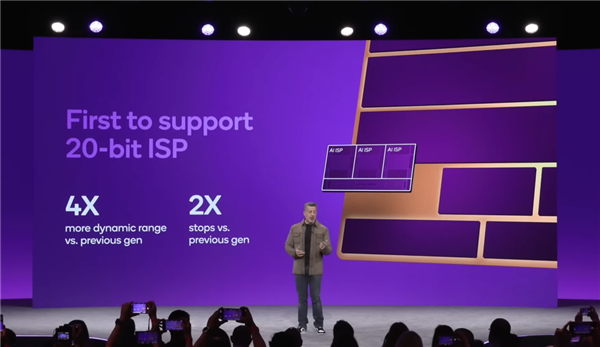 这代 ISP 最亮眼的突破,就是首次支持上了 20-bit 三 ISP,相比上代的 18-bit 三 ISP,它能多捕捉 4 倍的图像信息,这样在拍照录像时,就能更完整地保留画面明暗过渡和色彩层次。
