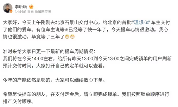 理想汽车产品线另一位负责人李昕旸则带来了理想i6的交付动态。他表示,“今天14:00左右,给所有昨天13:00到今天 13:00之间完成锁单的用户刷新预计交付时间。”“今年的产能依然是够的,大家可以继续放心下单。”