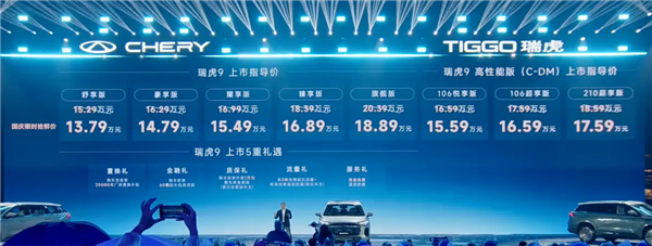 瑞虎9 C-DM共有3款车型,售价区间16.59-18.59万元,国庆假期抢鲜价15.59-17.59万元;瑞虎9X共推出3款车型,售价区间14.79-16.99万元,国庆假期抢鲜价12.79-14.99万元。