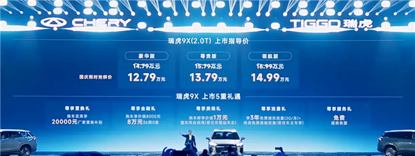 9月28日消息,日前,新款瑞虎9家族正式上市,其中新款瑞虎9共推出5款车型,售价区间15.29-20.39万元,国庆假期抢鲜价13.79-18.89万元;