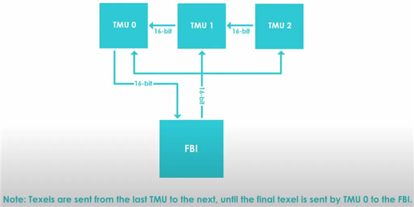 这两个芯片之间的总线为2×16位,一条用于读取,一条用于写入,写入总线可以访问三个TMU单元,数据通过每个TMU单元之间的单向串行连接返回,直到所有数据通过TMU 0获取。