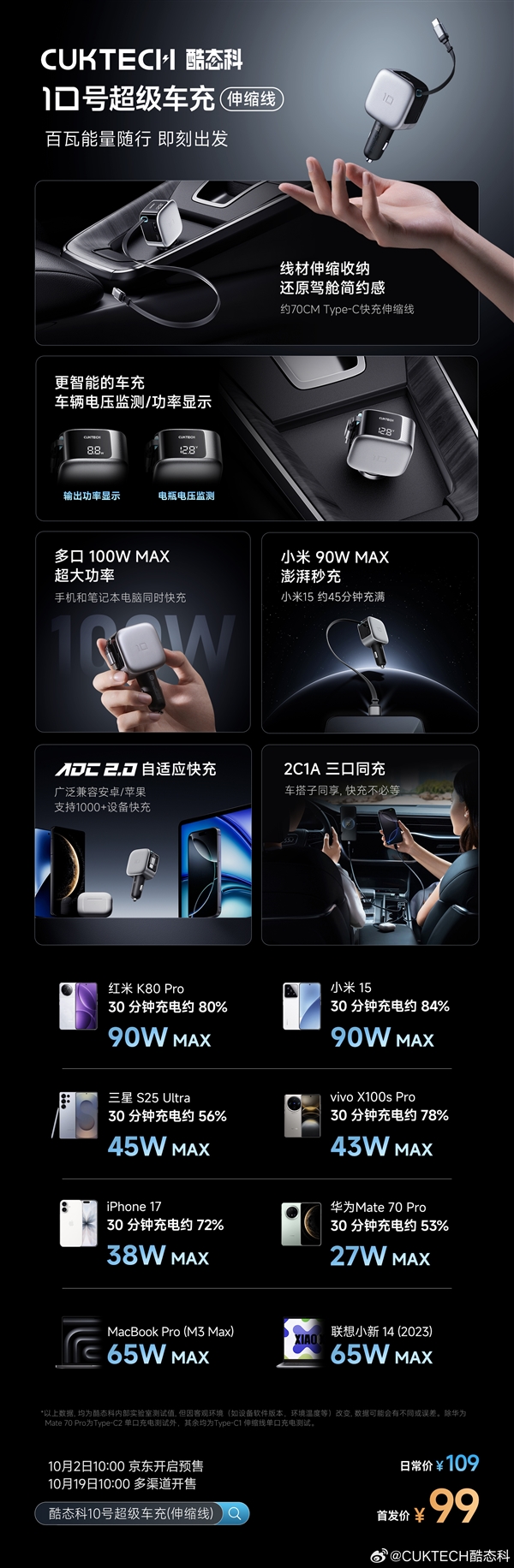 99元!酷态科10号超级车充伸缩线发布:2C+1A接口、多口100W快充