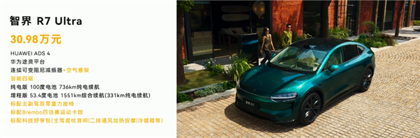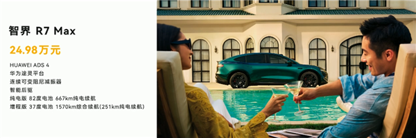 全系增程、纯电版本同价,各有两款版本。其中,新款智界R7入门Max版,纯电配备82kWh电池,续航为667km;增程版为37kWh电池包,纯电251km,综合续航1570km。