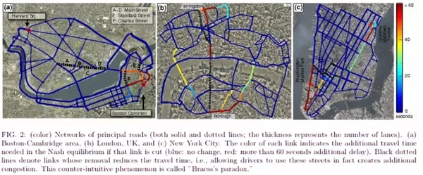 在红波带的背后,其实有一个反常识的交通理论——布雷斯悖论。这一理论是说,在路网中增加道路,或让某条路更顺畅,反而会让整个路网效率下降。比如国外某城市,曾有一条六车道快速路,整日拥堵。政府拆了这条路改建成公园,大家都以为会更堵,结果通勤时间反而减少了——这是因为没有这条路,司机们不再扎堆挤一条路,而是分散到周边支路,整个路网的车流更均衡了,拥堵也就得到了缓解。当然,这种策略的成功高度依赖路网结构,并非普适方案。