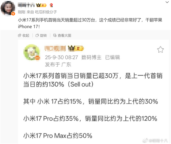 小米17系列手机首销当天销量超30万台 Pro机型最卖座:网友喊话打败苹果17