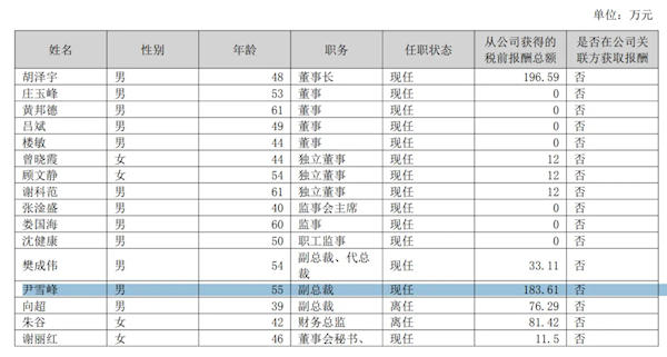 其中,董事长胡泽宇从公司获得的税前报酬总额为196.59万元;副总裁尹雪峰为183.61万元,两人年薪占公司所有董监高工资近四成。