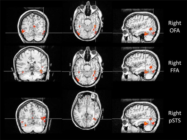 与认脸有关的三个核心脑区,自上而下依次为:OFA(枕叶面孔区)、FFA(梭状回面孔区),以及 STS(上颞沟)。图片来源:doi: 10.1007/s00221-011-2579-1